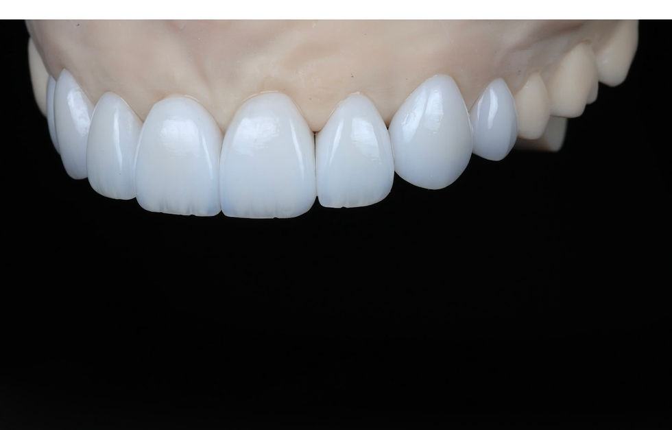 A collection of close-up views showcasing various dental prosthetics and ceramic veneers on models and teeth. The images highlight the detailed work and precision of dental research lab's prosthetics.